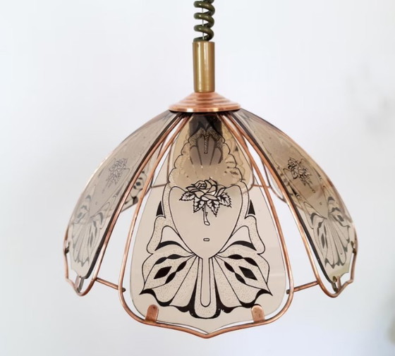 Questo bellissimo lampadario è stato creato negli anni '80 del secolo scorso in Jugoslavia. È realizzato in metallo e vetro con un bellissimo motivo. Ha 6 vetri affumicati che emettono una bella luce nella stanza; per il funzionamento è necessaria 1 lampadina.