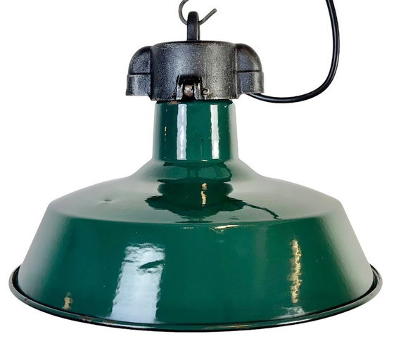 Lampada a sospensione industriale in smalto verde scuro, realizzata in Francia negli anni '60. Paralume smaltato bianco all'interno. Parte superiore in ghisa. Il portalampada richiede lampadine standard E27/E26. Cavo nuovo. Il peso della lampada è di 1,7 kg. Il diametro del paralume è di 34 cm.