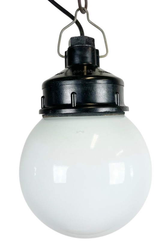 Lampada a sospensione industriale in bachelite con vetro opalino, anni '70