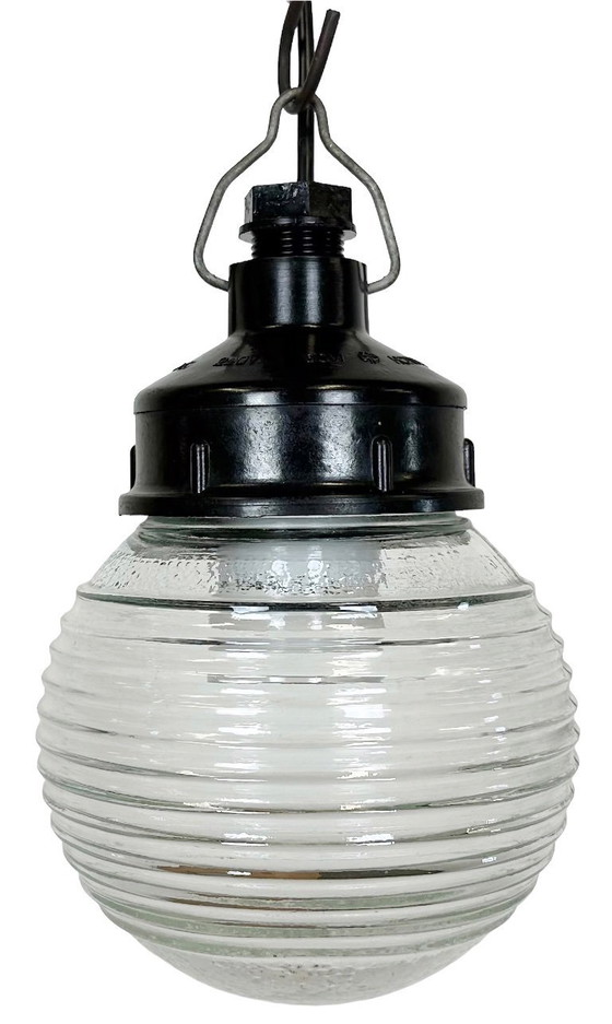 Lampada industriale vintage realizzata nell'ex Unione Sovietica negli anni '70. Presenta una parte superiore in bachelite marrone e una copertura in vetro scanalato. Il portalampada richiede lampadine E27/E26. Cavo nuovo. Il peso della lampada è di 0,9 kg.