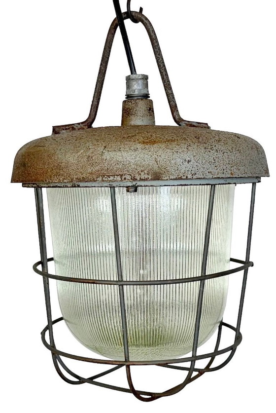 Lampada a sospensione industriale realizzata da Polam Wilkasy in Polonia negli anni '60. Presenta una parte superiore in ghisa, una copertura in vetro rigato e una griglia in ferro. Il portalampada in porcellana richiede lampadine standard E27/E26. Cavo nuovo. Il peso della lampada è di 7 kg.