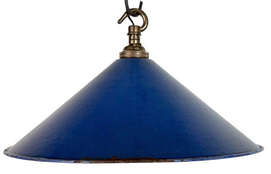 Lampada a sospensione industriale in smalto blu, realizzata nel Regno Unito negli anni '50. Paralume in smalto bianco all'interno. Parte superiore in ottone. L'attacco richiede lampadine a baionetta B22. Cavo nuovo. Il peso della lampada è di 0,3 kg. Il diametro del paralume è di 25 cm.