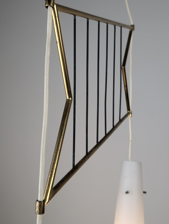 Lampada a sospensione italiana in opalino e ottone, stile Stilnovo, anni '50