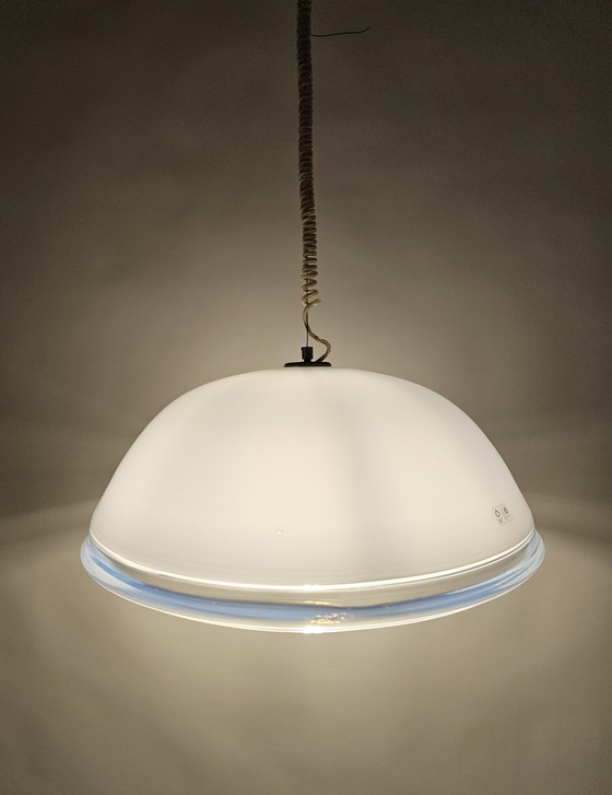 Lampada a sospensione italiana in vetro satinato con bordo trasparente