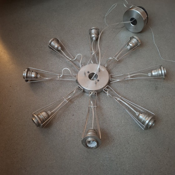 Splendida lampada a sospensione di Lumina, la Matrix Otto, disegnata da Yaacov Kaufman. È stata appesa sopra il tavolo da pranzo ed è in ottime condizioni. Con sfere luminose trasparenti abbinate, diametro 68 cm. Attualmente impostata a un'altezza di 50 cm, ma probabilmente regolabile. La Matrix Otto è un lampadario moderno di Lumina degli anni '90, un design minimalista con otto bracci, che possono essere piegati verso l'alto e verso il basso. I portalampada in metallo sono fissati tramite un filo d'acciaio, che consente loro di muoversi in tutte le direzioni. In questo modo, la Matrix Otto può facilmente riempire spazi più ampi e sta benissimo sopra un tavolo da pranzo o in un corridoio. #lumina #matrixotto #yaacovkaufman #spinlamp #lamp #lamptekoop #moderno #design