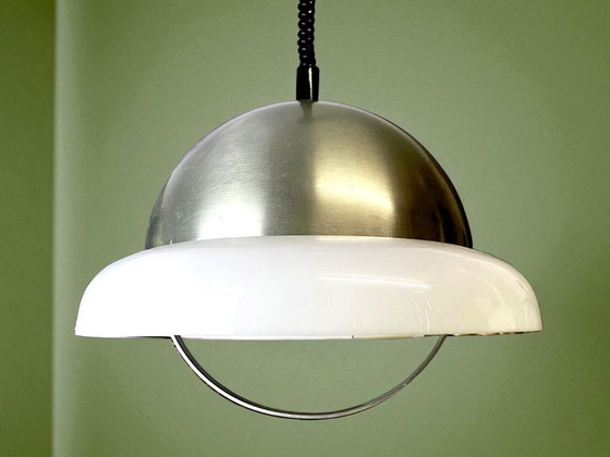 Lampada a sospensione a scomparsa Space Age, progettata e realizzata negli anni Sessanta. Sapientemente realizzata con materiali di altissima qualità - alluminio spazzolato e acrilico bianco - questa lampada vintage si adatta molto bene agli interni moderni. Sarà perfetta sopra il corridoio della cucina o il tavolo da pranzo. Il paralume interno è dipinto di bianco, per garantire un'ampia illuminazione.