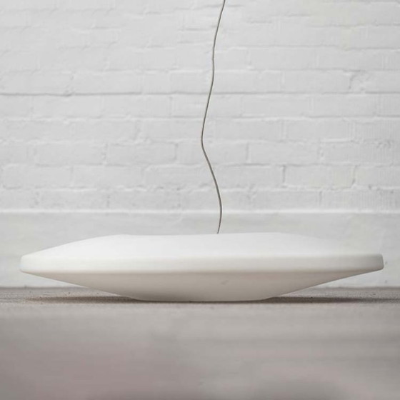 La lampada a sospensione si caratterizza per una forma ampia e piatta che distribuisce la luce in modo uniforme. Il design si concentra sull'illuminazione funzionale all'interno di un volume ben definito.