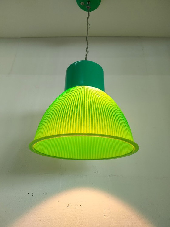 Bellissima lampada a sospensione in plastica verde. La parte inferiore è scanalata e realizzata in plastica rigida. La parte superiore è in metallo. In ottime condizioni vintage. Presenta alcuni segni d'uso, ma minimi (vedi foto).