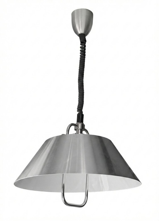 Ottime condizioni vintage autentiche. L'integrità strutturale è eccellente e il meccanismo Rolly funziona senza intoppi. Come ogni autentico pezzo di design di 50 anni fa, mostra lievi segni del tempo, tra cui lievi micrograffi e un piccolo graffio sul paralume in alluminio (vedere la foto finale). Questi sono praticamente impercettibili una volta appesa la lampada. Il cablaggio è stato completamente controllato e la lampada è pronta per l'installazione.