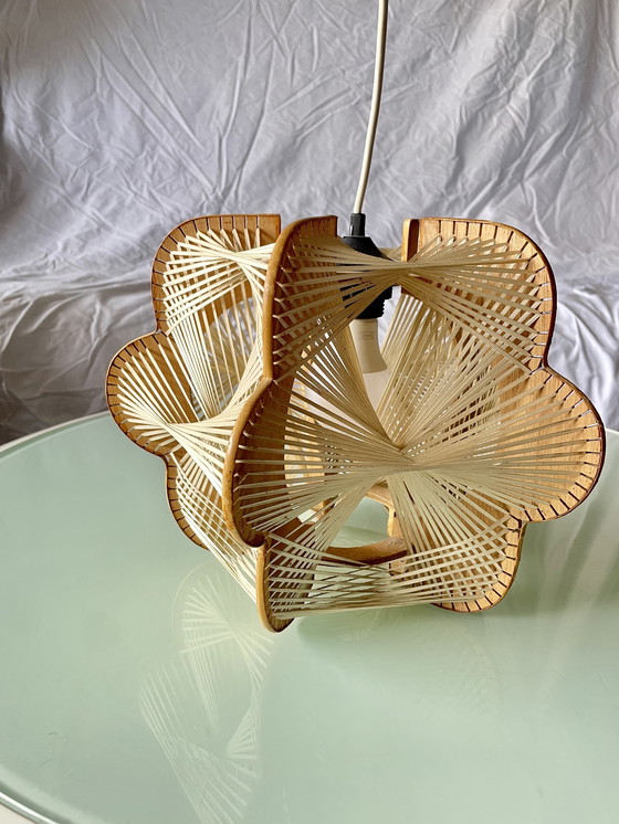 Lampada a sospensione con paralume in legno e cavi in stile scandinavo degli anni '50/'60. Prodotta in Francia.