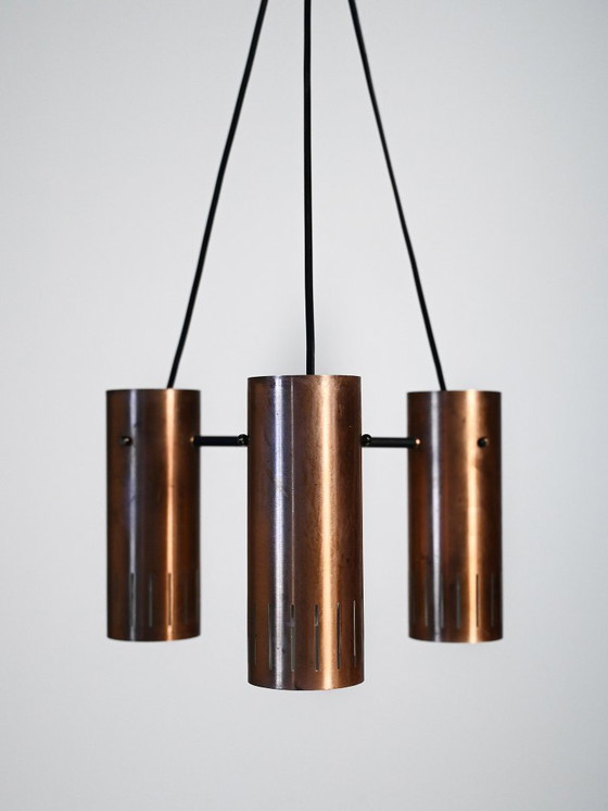 Lampadario a sospensione scandinavo della fine degli anni '50/'60, caratterizzato da tre cilindri in rame con fessure verticali. Le perforazioni diffondono una luce morbida e calda sulla superficie sottostante, mentre uno stelo trasversale cromato nero riunisce il trio con elementi in rame coordinati. Minimale nella forma ma di forte presenza, gioca sul contrasto tra il rame caldo e la struttura scura.