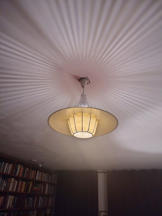 Questa lampada a sospensione vintage scandinava della metà del XX secolo è un bellissimo esempio di design senza tempo. Con le sue linee eleganti e la delicata palette di colori, questa lampada aggiunge un tocco di stile moderno di metà secolo a qualsiasi ambiente.