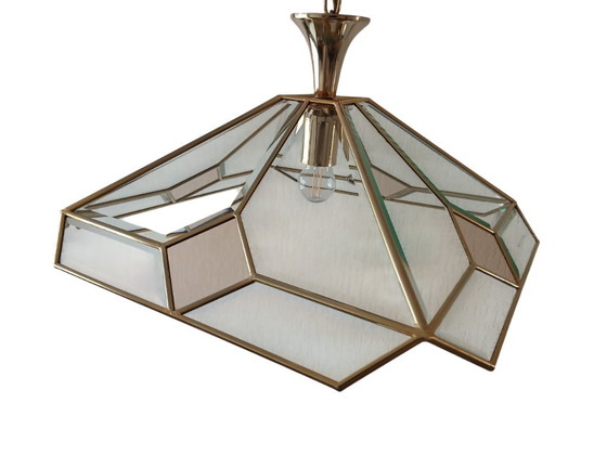Splendida lampada a sospensione di design italiano in ottone e vetro sfaccettato. La lampada è marchiata.
