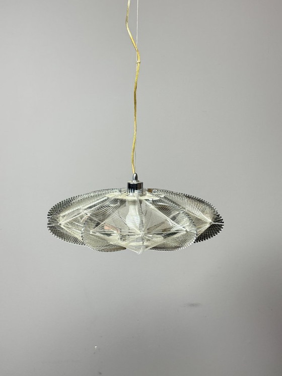 Suggestiva lampada a sospensione Space Age di Sompex, attribuita al designer Paul Secon. Il paralume astratto è composto da fili di nylon combinati con elementi in plexiglas, creando un effetto scultoreo e di diffusione della luce. Un oggetto di illuminazione audace ed espressivo degli anni '70. Dimensioni: Altezza 15 cm, Larghezza 50 cm.