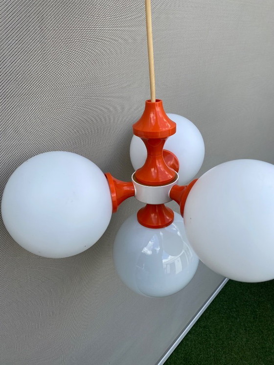Funky Sputnik Globe lampadario degli anni '60 con 4 sfere di vetro opalino bianco su una struttura di plastica arancione. Il globo inferiore ha una maggiore lucentezza.