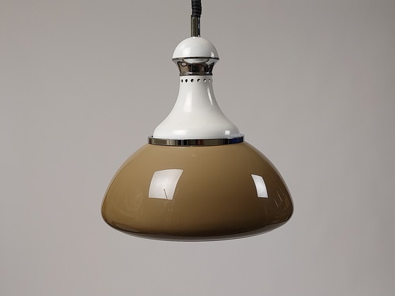 Rara lampada a sospensione vintage del rinomato marchio italiano Stilux, un elegante esempio di design moderno di metà secolo. La lampada presenta un'elegante combinazione di un paralume superiore in metallo bianco e di un paralume in plastica di colore marrone con una bella lucentezza. Gli accenti cromati conferiscono alla lampada un aspetto senza tempo.