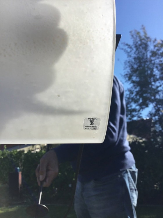 Lampada a sospensione, struttura in bronzo con 2 paralumi in vetro di Murano