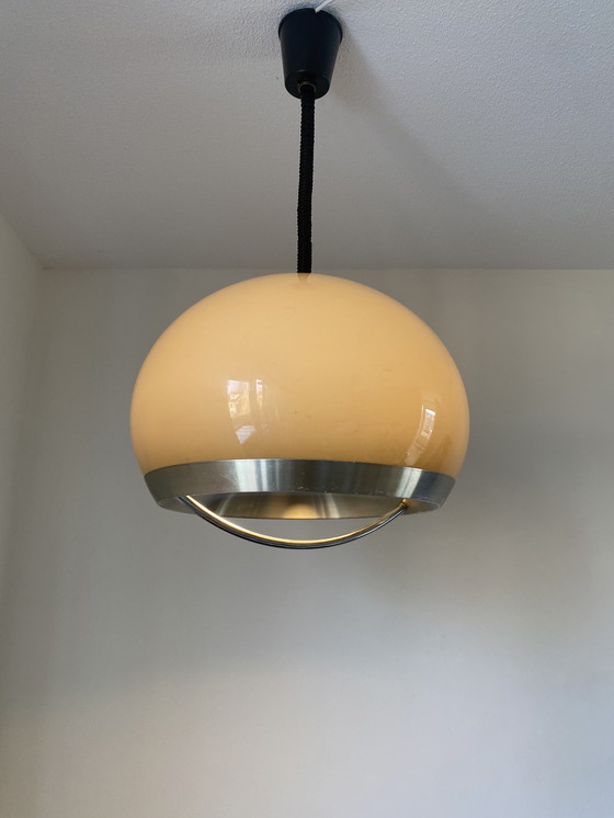 Bellissima lampada a sospensione vintage a forma di fungo con globo in vetro acrilico marrone e cromo. Lampada di metà secolo in tipico design olandese degli anni '70. In buone condizioni vintage. Presenta qualche piccolo graffio qua e là, ma non sono evidenti. Dimensioni: P: 50 cm, A: 40 cm. Dijkstra, Herda, Space Age, Guzzini