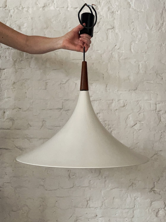 Lampada a sospensione vintage di metà secolo, anni '60. Originaria della Danimarca, realizzata in acciaio con piano in teak. Nello stile di Thorup e Bonderup per Fog & Morup, ma non ne conosco il designer.