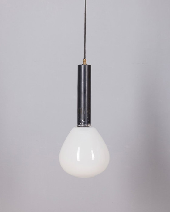 Lampada a sospensione con struttura in metallo nero e paralume in vetro bianco, altezza regolabile, design italiano, anni '70.