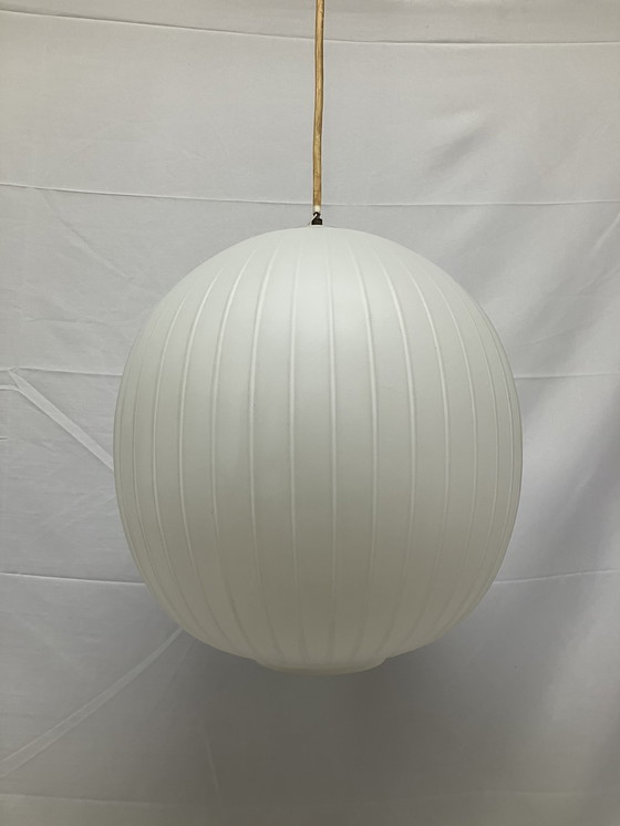 Questa elegante lampada a sospensione è stata progettata negli anni '50 da Aloys Gangkofner per Peill & Putzler. Presenta un paralume sferico in vetro opalino con una sottile struttura a coste verticali, che crea un raffinato gioco di luci e ombre. La luce morbida e diffusa enfatizza la luce.