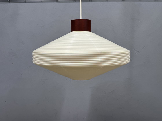 Lampada a sospensione vintage, lampada in plastica, anni '60, design scandinavo, stile Mid-Century Modern, illuminazione retrò, dettagli in legno.
