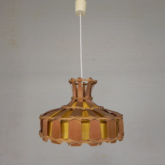 Altezza: 75 cm. Altezza paralume: 27 cm. Diametro: 43 cm. La lampada ha un attacco grande (E27). Il tessuto giallo presenta un piccolo foro e una macchia marrone (vedi foto dettagliate). Origine: Francia, anni '70. Materiale: rattan, tessuto, foglia di palma. Tutte le nostre lampade sono adatte per lampadine a LED.