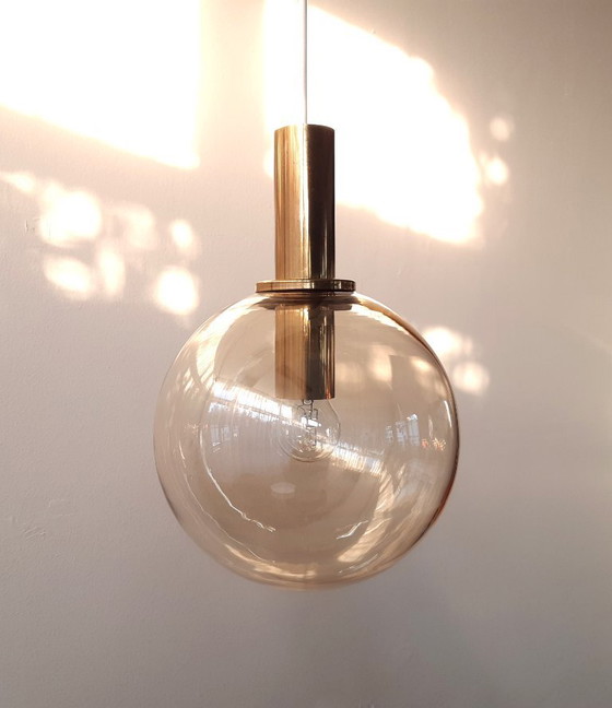 Lampada a sospensione vintage con sfera in ottone e vetro ambra, lampada a sospensione mcm