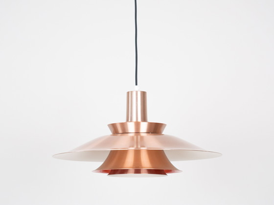 Lampada in alluminio Lyskaer degli anni '80. La forma della lampada è stata progettata basandosi sul principio di un sistema riflettente, che dirige la luce non solo verso il basso, ma anche ai lati, illuminando al contempo la lampada stessa. Grazie alla sua struttura, la lampada emette una luce diffusa e non abbagliante, dal tono caldo. Dimensioni: Diametro 47 cm Altezza 25 cm La lampada è in ottime condizioni, presenta una leggera scoloritura visibile nelle foto. La lampada è stata accuratamente pulita e il cavo è stato sostituito con uno nuovo, intrecciato. La lampada è dotata di un nuovo rosone in metallo.