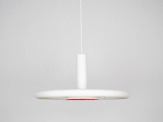 La lampada Optima è stata progettata nel 1973 da Hans Due e prodotta dall'azienda danese Fog og Morup. La serie Optima è caratterizzata da linee morbide, chiaramente ispirate allo stile spaziale. Le lampade di questa serie sono dotate di uno schermo riflettente interno con un'elegante linea rossa interna, che fornisce un'illuminazione uniforme e antiabbagliante, sia in posizione alta che bassa.