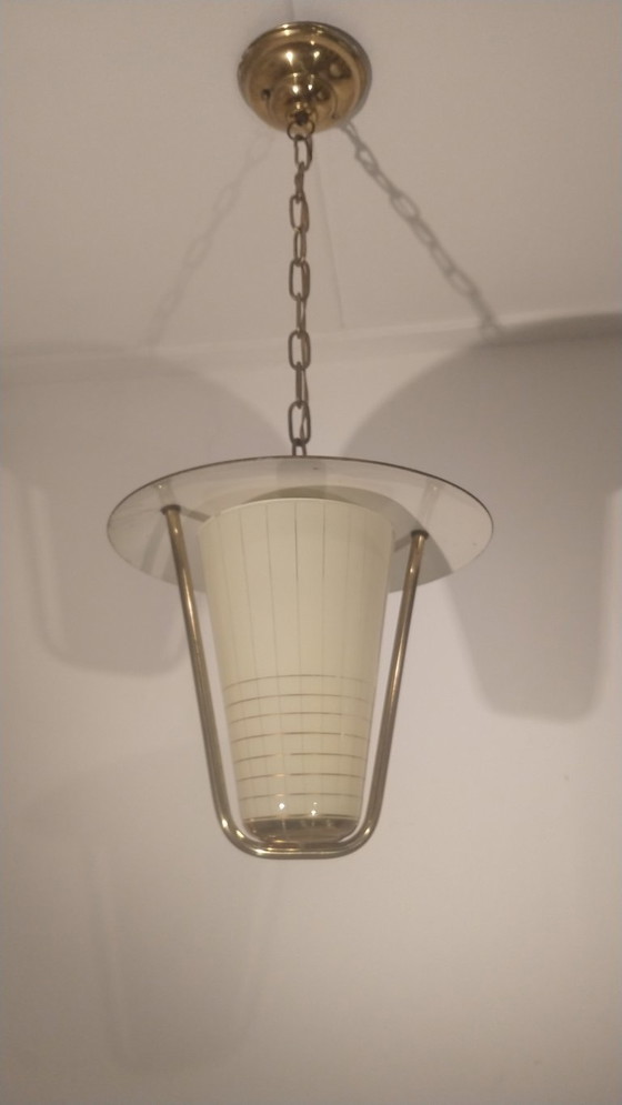 Aggiungi un tocco di fascino anni '50 alla tua casa con questa splendida lampada a sospensione vintage. La combinazione di vetro e metallo crea un look elegante che si adatta perfettamente a interni retrò o moderni.