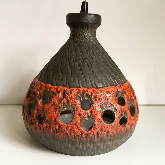 Una grande lampada a sospensione Fat Lava degli anni '70. Questa lampada in ceramica, pesante e robusta, ha una base marrone con un bordo smaltato arancione Fat Lava. La smaltatura a strati evoca la lava vulcanica che scorre, da cui il nome Fat Lava. Il paralume marrone è opaco, mentre la smaltatura arancione ha una splendida lucentezza. L'interno del paralume è bianco, il che, insieme alle aperture, crea una luce calda e suggestiva. Questa lampada è un vero colpo d'occhio e si adatta perfettamente a un interno retrò. Dimensioni: 30 cm di altezza e 28 cm di diametro.