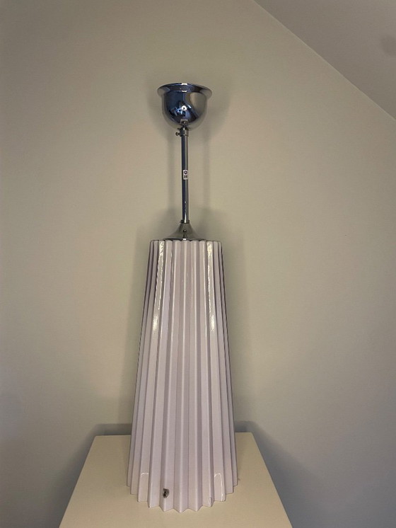 La lampada è stata progettata da A. Nillson, H. Preutz e T. Eliasson. Presenta un paralume in vetro plissettato bianco opalino che diffonde una luce morbida e diffusa. La lampada presenta la sospensione originale in tubo metallico cromato, che le conferisce un aspetto elegante e moderno.