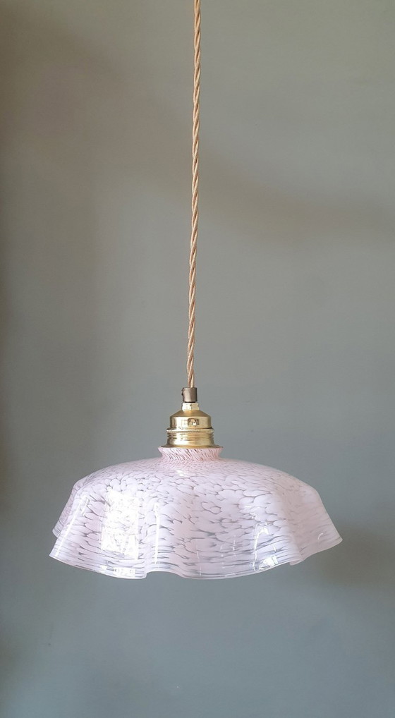 Lampada a sospensione vintage a forma di fazzoletto con pieghe. Lampada a sospensione degli anni '30 con vetro rosa e trasparente.