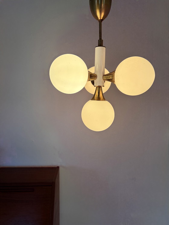 Splendida e unica lampada a sospensione. Rosone in ottone con attacco in metallo verniciato bianco e splendidi dettagli in ottone. La lampada ha quattro bracci in ottone a forma di tulipano da cui pendono quattro globi in vetro opalescente. Splendida luce diffusa.