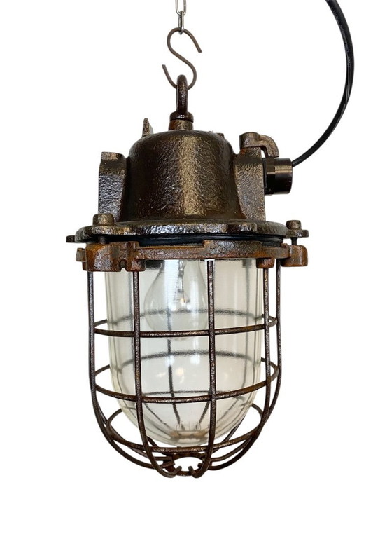 Lampada a sospensione industriale realizzata nell'ex Cecoslovacchia negli anni '60. Presenta una parte superiore in ghisa, una copertura in vetro trasparente e una griglia in ferro. Il portalampada in porcellana richiede lampadine standard E27/E26. Cavo nuovo. Il peso della lampada è di 9 kg.
