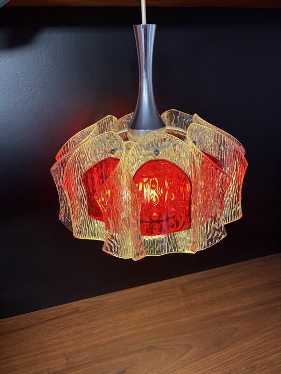 Attorno ad esso sono presenti otto paralumi in acrilico, alcuni trasparenti e altri rosso mirtillo. Questo crea una luce calda e piacevole. Tipico degli anni '60. La lampada è in buone condizioni; solo i paralumi in acrilico presentano alcuni graffi o crepe tipici dell'epoca. Attacco standard grande (E27) (la lampadina non è inclusa nel prezzo).
