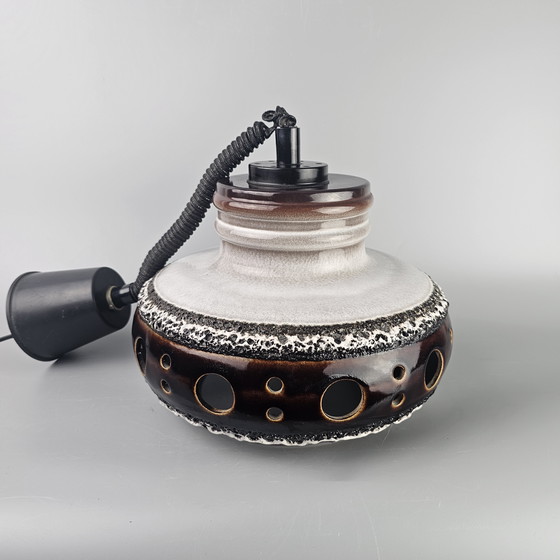 Lampada a sospensione vintage XL in ceramica marrone/bianca di Herda. Lampada a sospensione UFO degli anni '70. Lampada Fat