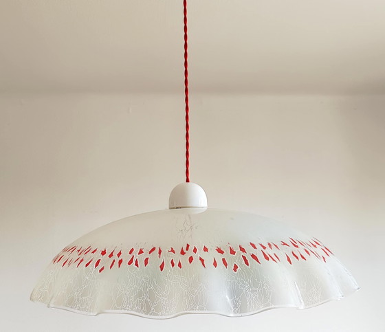 Composta da un grande vetro dal bordo ondulato con motivi di crepe bianche e rosse. Montata elettricamente: filo di tessuto rosso intrecciato, campana bianca, presa E27. Cablaggio pulito e funzionale, dà una bella luce quando è accesa, perfetta per una cucina.