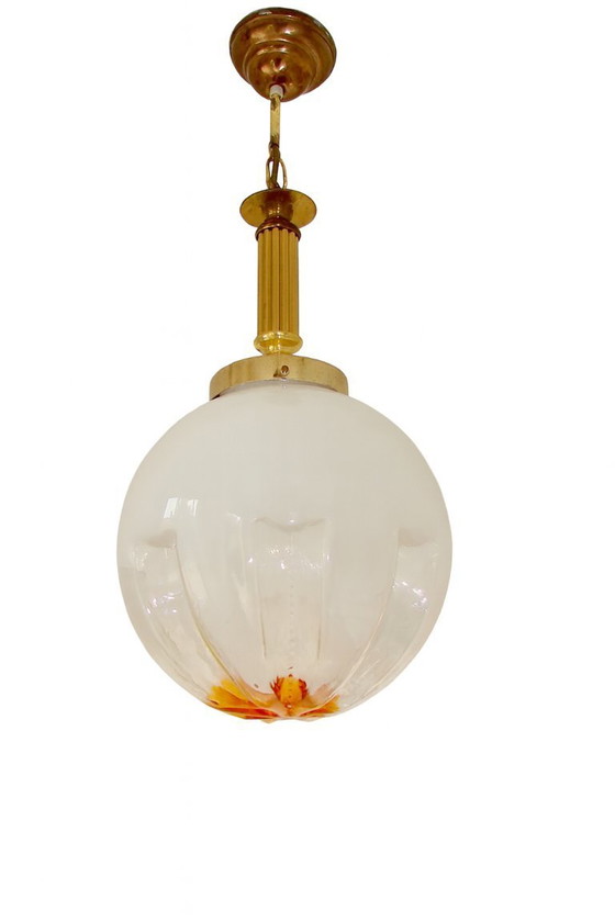 La lampada a sospensione Mazzega degli anni '70 è un esempio unico di design italiano dell'epoca. Il paralume sferico è realizzato in vetro stampato con sottili decorazioni e la montatura in ottone conferisce all'intero pezzo un carattere elegante. La lampada è perfetta per interni arredati in stile vintage, retrò, moderno di metà secolo o eclettico.