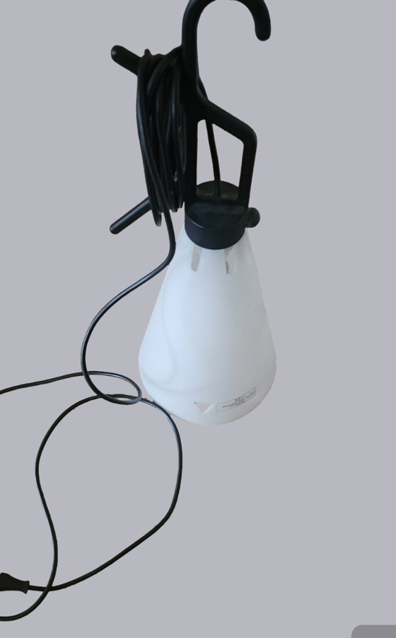Lampada di design originale FLOS, proveniente dall'Italia, con paralume in plastica bianca opaca e gancio di sospensione nero. Design elegante, minimalista e industriale. Adatta come lampada a sospensione, lampada da lavoro o illuminazione d'atmosfera in interni moderni, studi o corridoi.