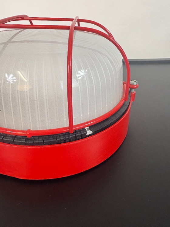 Questa lampada da parete industriale degli anni '80 presenta una robusta struttura in metallo rosso con un design a gabbia protettiva, che ospita una copertura in vetro a coste. Il suo audace colore rosso aggiunge un accento sorprendente a qualsiasi spazio, mentre la copertura in vetro assicura una luce morbida e diffusa. Ideale per aggiungere un tocco industriale vintage al vostro arredamento.