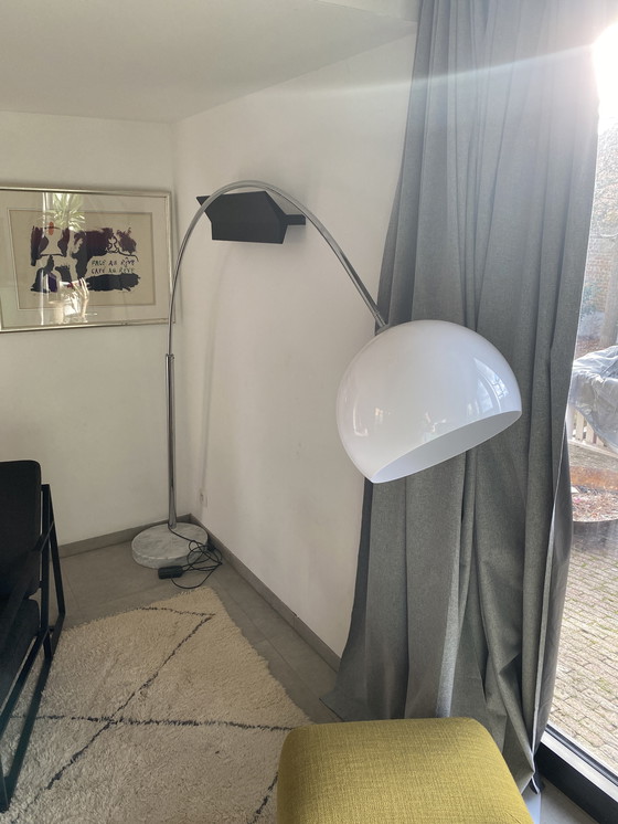 Lampada ad arco con paralume in plastica bianca e luce dimmerabile. Vedi foto per eventuali segni di ossidazione. Il supporto è leggermente allentato rispetto alla base in marmo.