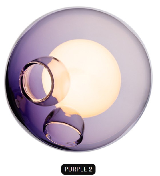 La lampada bocci nel colore 'purple 2' e baldacchino in nichel spazzolato. Fa parte della serie 28; uno speciale processo di fabbricazione in cui la temperatura e la direzione della soffiatura del vetro portano a una sfera con "satelliti", in questo caso 2 bolle interne.