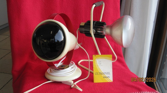 La lampada a sinistra è il modello 7526 e può essere utilizzata come lampada da parete, lampada a sospensione o lampada da tavolo. La sua staffa rossa ne facilita la regolazione. Anche questa lampada ha un attacco a baionetta.