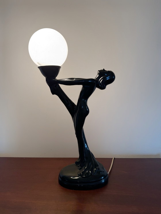Graziosa lampada da tavolo a forma di ballerina degli anni '70, revival Art Déco in resina laccata nera e globo opalino bianco; ottime condizioni generali, per lampadina a vite piccola Altezza massima: 50 cm Lunghezza: 27 cm Larghezza: 13,5 cm Peso: 2,4 kg Spedizione veloce e accurata