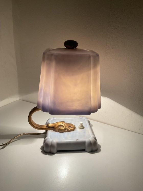 Adorabile lampada da comodino Art Déco. Paralume in bachelite azzurro marmorizzato. Il paralume presenta due piccole crepe discrete, una delle quali è stata incollata (vedi foto). Il paralume può essere ripiegato. Il paralume è fissato a una base in bachelite con una sezione in metallo color oro. Un interruttore della luce si trova sulla base.