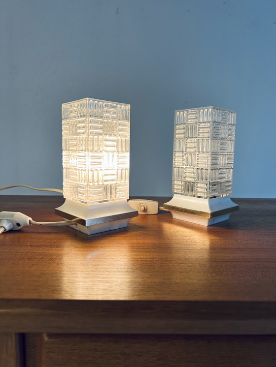 Un grazioso set di due lampade da comodino vintage degli anni '60. Base in plastica rigida e paralume in cristallo con un grazioso motivo a blocchi quadrati. Piccola presa e interruttore sul cavo. Dimensioni: altezza 17 cm, larghezza 9 cm.