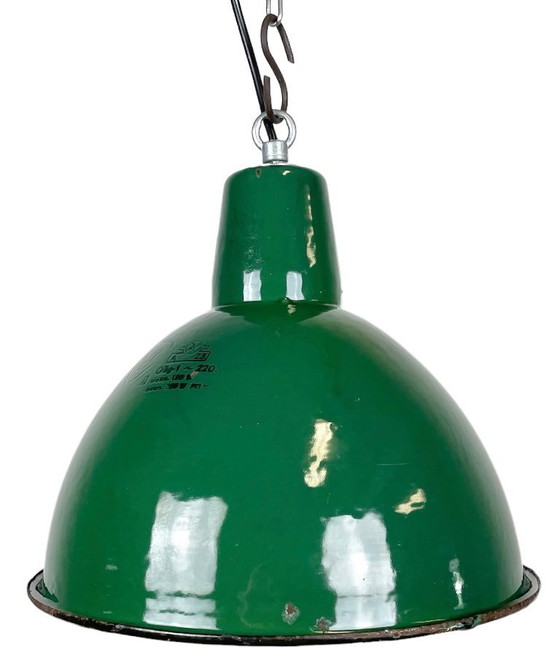 Lampada a sospensione industriale in smalto verde, realizzata da Polam Wilkasy in Polonia negli anni '60. Paralume in smalto bianco all'interno. Parte superiore in ferro. Il portalampada in porcellana richiede lampadine E27. Cavo nuovo. Perfettamente funzionante. Il peso della lampada è di 1 kg.