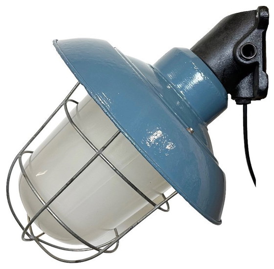 Questa lampada da parete industriale è stata progettata negli anni '60 e prodotta da Elektrosvit nell'ex Cecoslovacchia. Presenta un attacco a parete in ghisa nera, un paralume appena verniciato di blu con interno in smalto bianco, una copertura in vetro opalino e una griglia in ferro. Il nuovo portalampada in porcellana richiede lampadine standard E 27 / E 26. Cavo nuovo. Il peso della lampada è di 6 kg. Il diametro del paralume è di 35 cm.